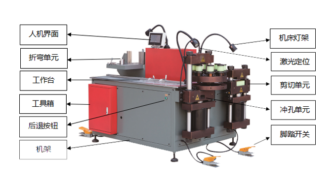 機(jī)器由機(jī)架、沖孔單元、剪切單元、折彎單元、工作臺(tái)、液壓站、電氣控制單元、模具、人機(jī)界面等組成。
