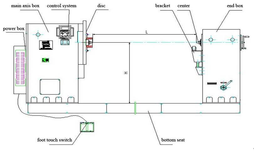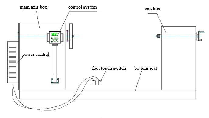 5, Design description: outline of whole machine This horizontal coil winding machine is mainly made of main axis box, end box, bottom seat and control system(check the following picture)