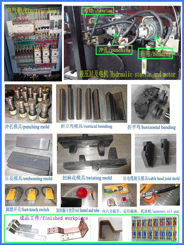 1,機(jī)器具有沖、剪、折三個(gè)加工單元,可分別進(jìn)行母線的沖孔、剪切、折彎加工,通過(guò)更換折彎單元的模具,還可以進(jìn)行壓平、壓花、壓電纜接頭、鈕花等特殊加工。
