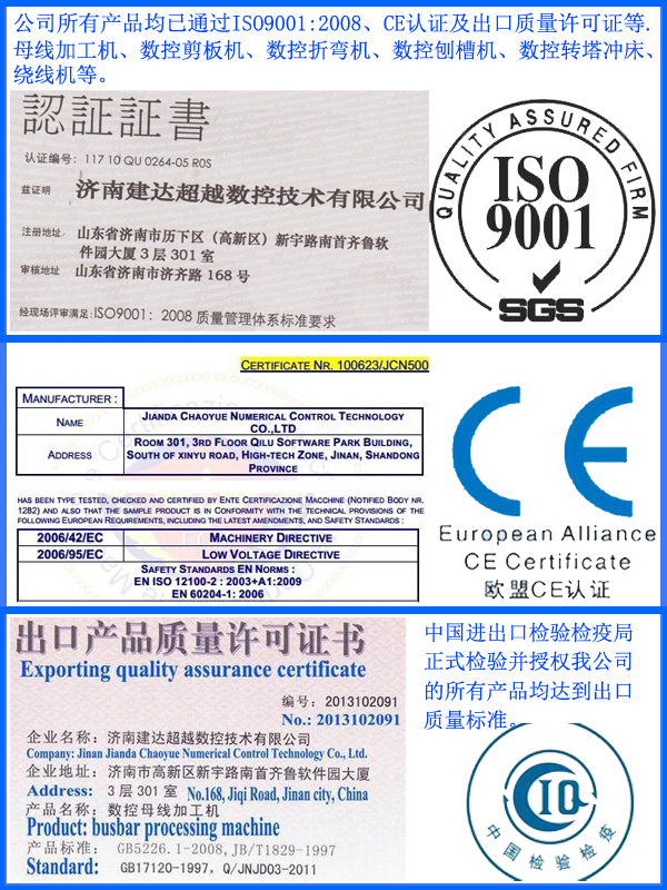 ISO9001:2008質(zhì)量認證;出口歐盟機電產(chǎn)品出口CE認證;擁有鍛壓機床出口質(zhì)量許可證;